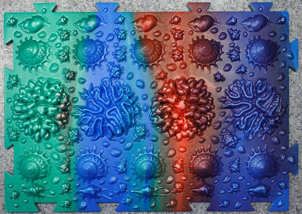 - Ортопедическое изделие разделяется на определенные зоны. На коврике расположены участки, которые способны имитировать натуральную траву, камни, неровности. Массажное изделие имеет один единый рельеф.