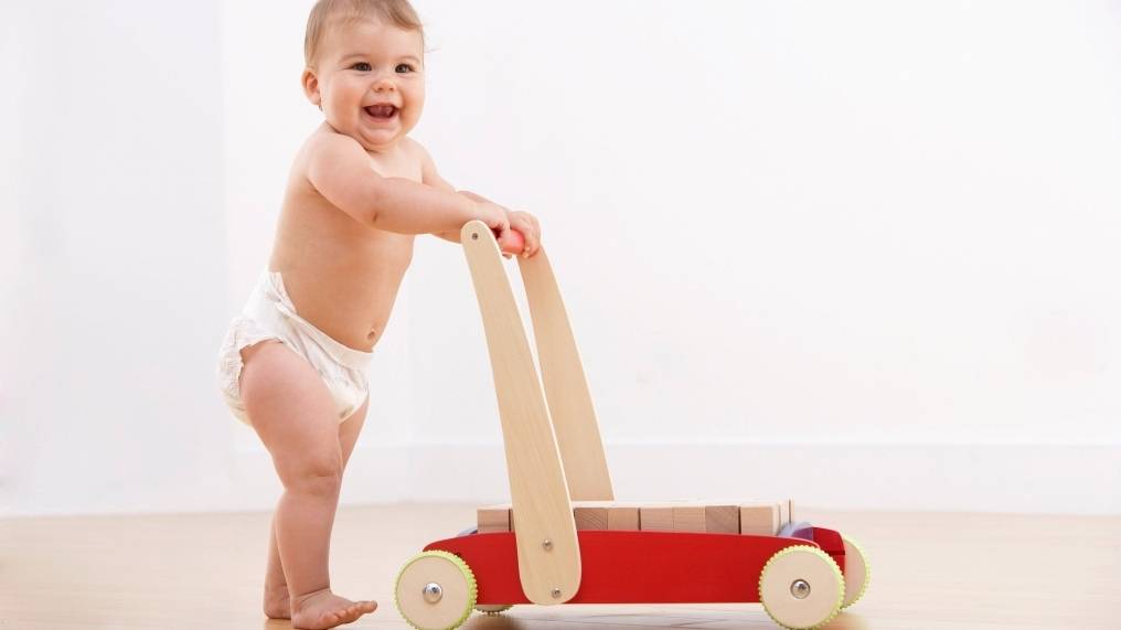 Некоторым, для того чтобы научиться двигаться вперёд, нужна помощь родителей, которые первое время будут осторожно тянуть ходунки вместе с карапузом. Или же просто положите в поле зрения крохи новую или любимую игрушку