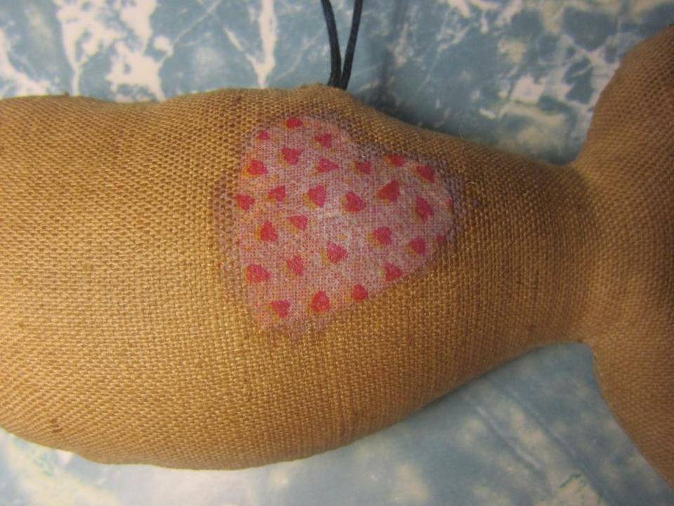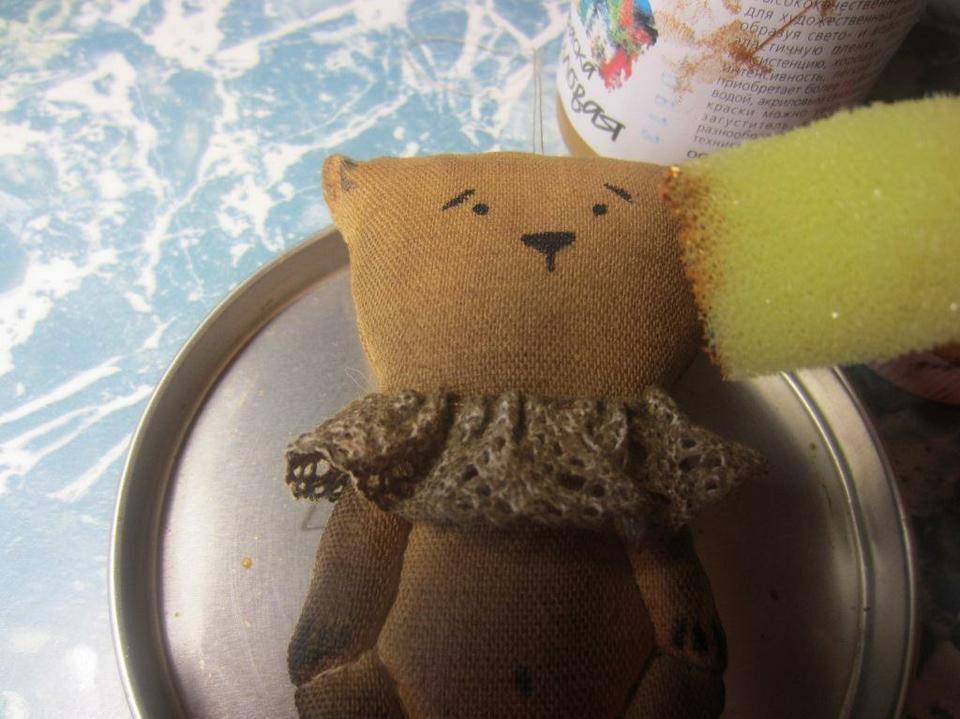 Можно украсить шею мишки жабо из хлопкового кружева. Для этого отрежьте кусочек кружева длиной в 2 раза больше окружности шеи и затонируйте.