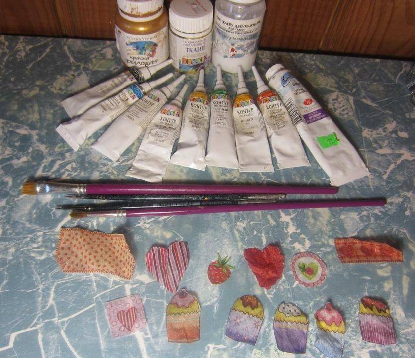Для декора можно использовать акриловые краски, контуры по ткани или стеклу и керамике, гелевые ручки, линеры, блестки, пастель, салфетки для декупажа, кружево, ленты и другие элементы, оказавшиеся под рукой.