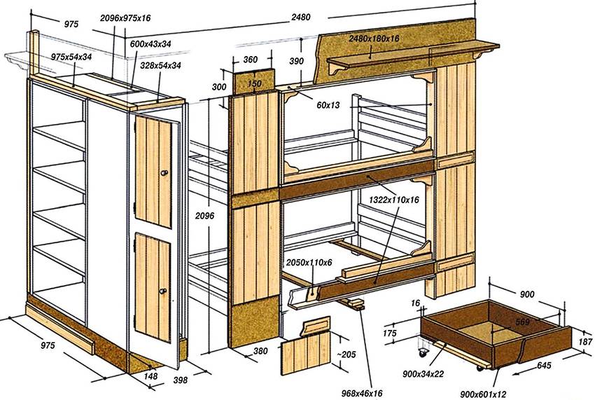 Для ограждения спального места используются фасадная и задняя боковины в виде сплошной или решетчатой стенки. Ножки кровати выполняются самостоятельно или приобретаются в магазине. В первом случае они могут быть отдельно прикрепленными или являются продолжением цельной основной конструкции.