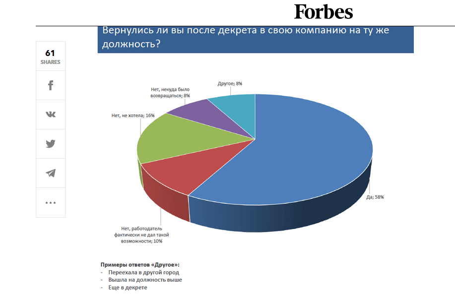 И дилемма терзает многих мамочек: что выбрать, вернуться назад или найти новое поприще. Приведу статистику, опубликованную в журнале Форбс.