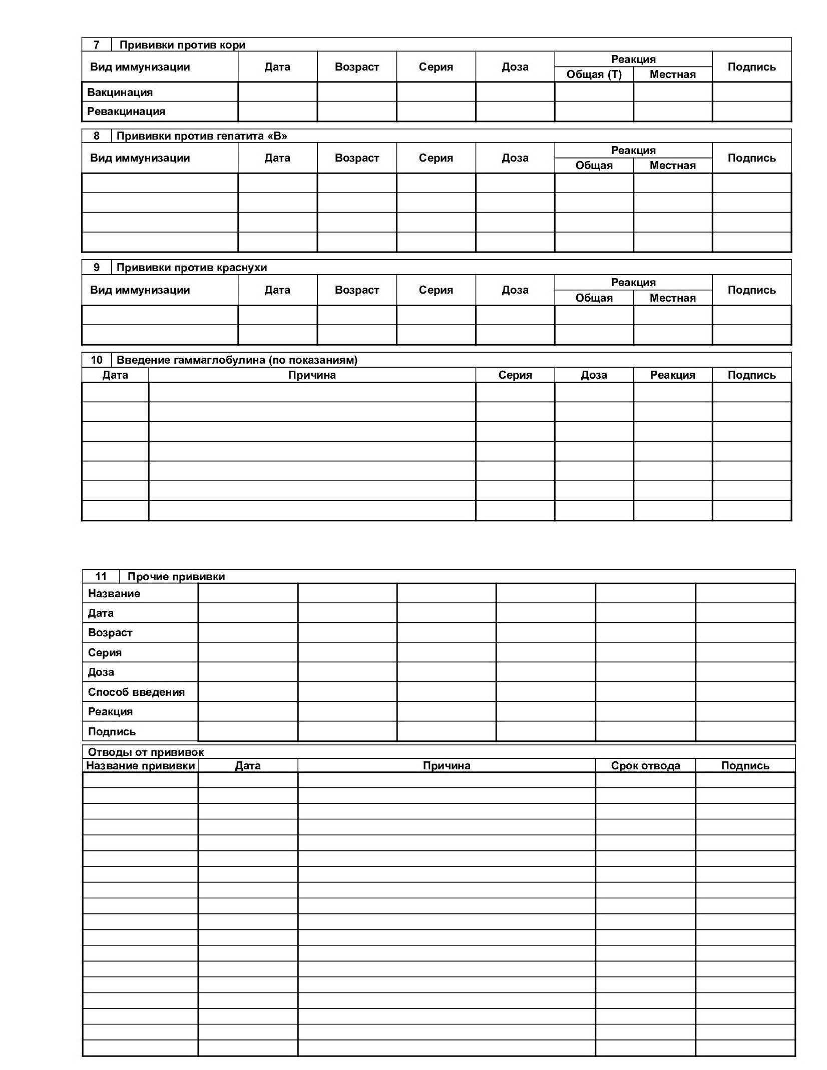 - в раздел 5 вносят сведения о прививках против дифтерии, коклюша, столбняка, указывают сведения о вакцинации и ревакцинации;