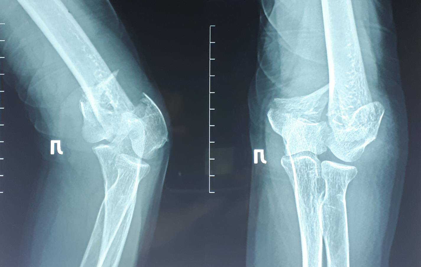 На представленных ниже рентгенограммах локтевого сустава определяется оскольчатый перелом мыщелков левого плеча с 4 большими фрагментами.