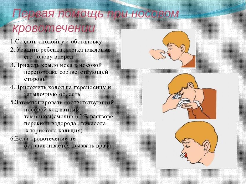 При развитии носового кровотечения у детей взрослым нужно немедленно выполнить действия, направленные на остановку кровопотери:
