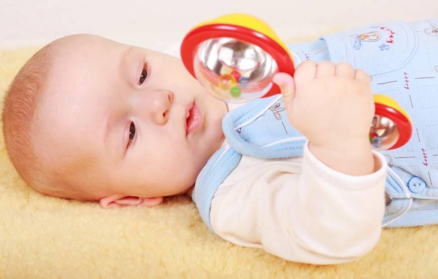 Некоторые мамы полагают, что уже с рождения ребенок может брать в руки погремушку, держать ее, опираясь на то, что дети рождаются с достаточно развитым хватательным рефлексом. Действительно, когда крохе исполняется 2 недели, он может держать предмет, который родители вложили в руку.