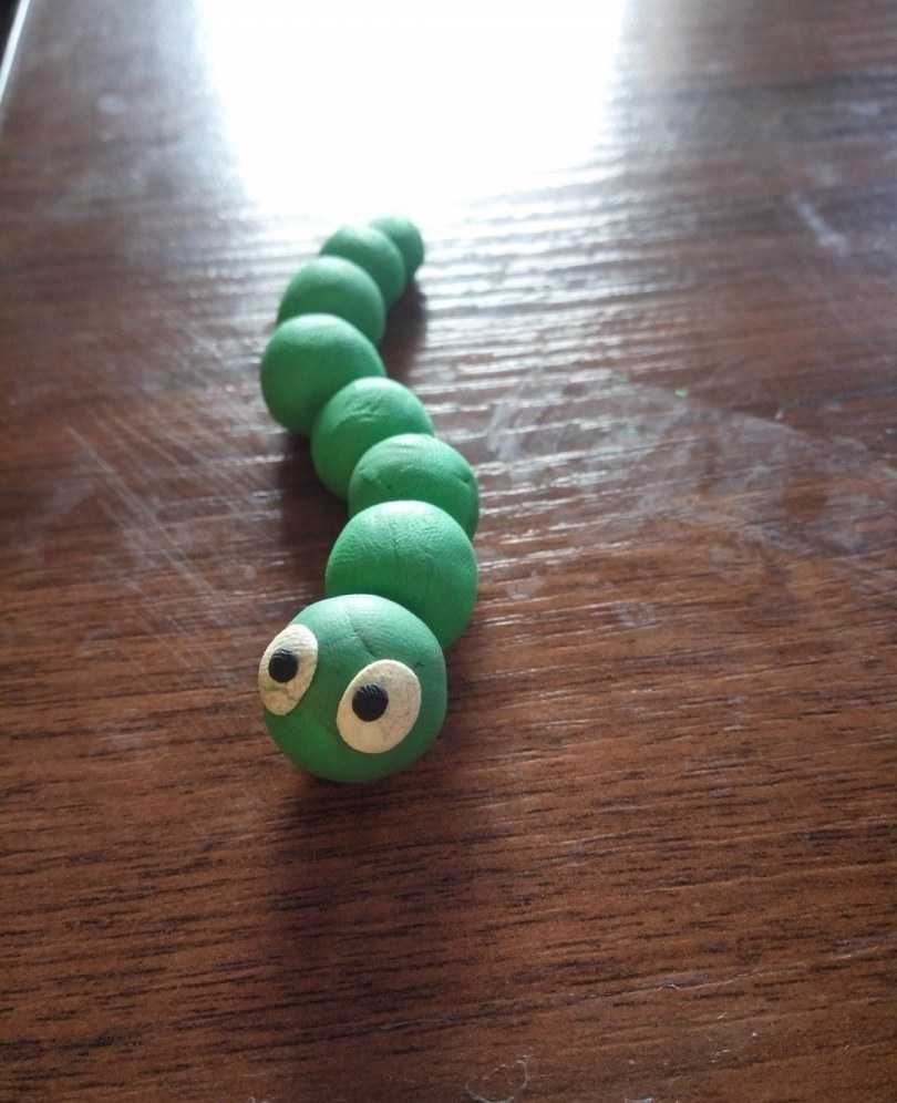 Такую поделку ребенок может сделать уже в 1-2 года. Делается она из обычных цветных шариков. Их нужно скатать из пластилина заранее. После этого отдельные детали крепятся друг к другу. Гусеница должна получиться объемной и большой. Ее можно изогнуть по своему желанию. Украсят такую поделку небольшие черно-белые глазки.