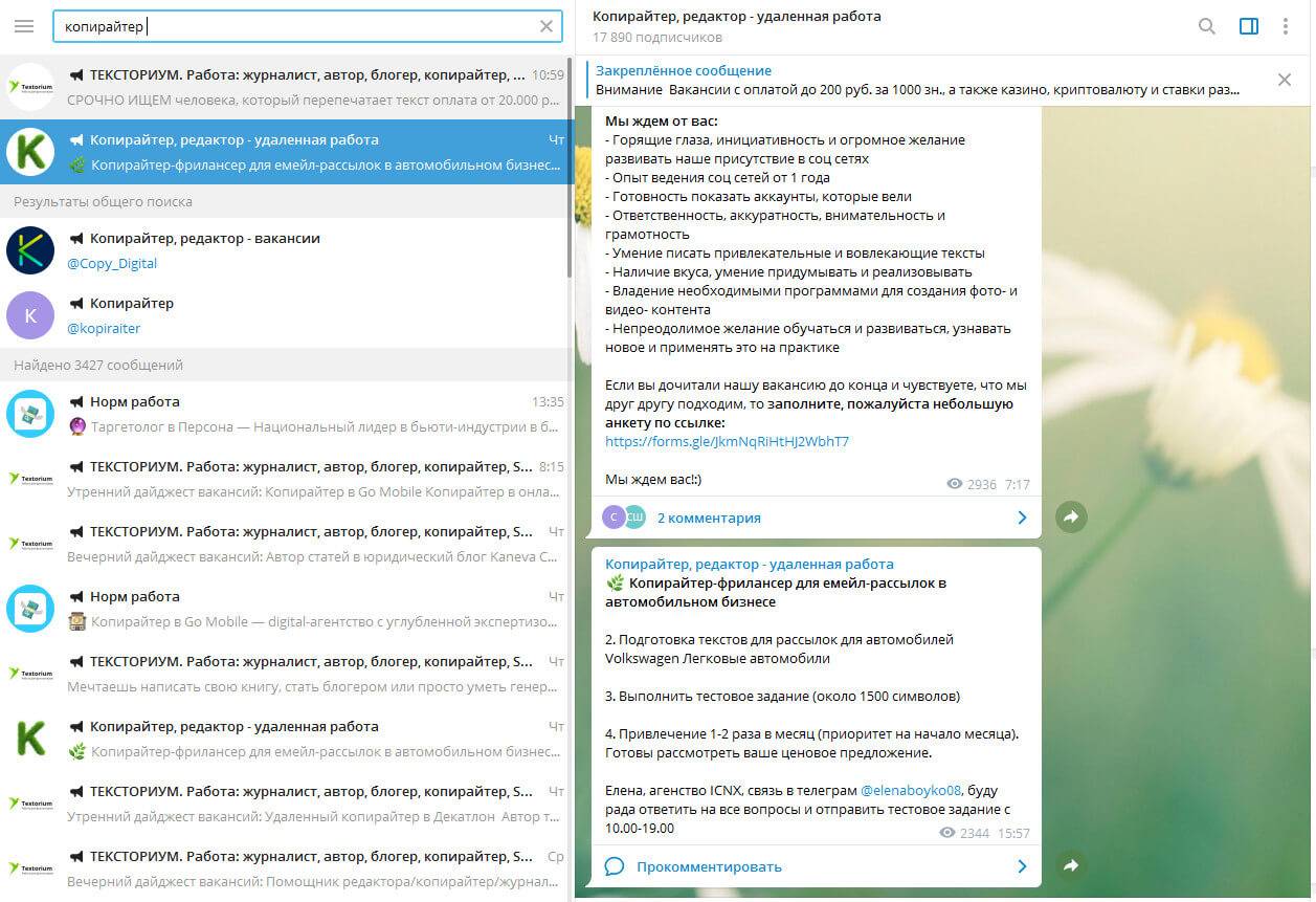 Чтобы было проще искать вакансию, можно ввести слово «копирайтинг» в поисковик – вам откроются предложения из каналов, на которые вы подписаны.