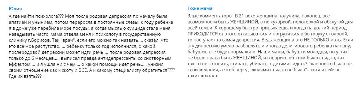 После такой реакции читателей мамы стали гораздо меньше просить о помощи, говорит Анастасия. В то же время создатели группы поняли, что помощь мамам нужна не только сразу после родов. И не только едой. В группе взаимопомощи появились волонтеры-психологи, которые совершенно бесплатно помогают мамам справиться с эмоциональным выгоранием и депрессией. Потому что если депрессию не лечить, то она может длиться годами.