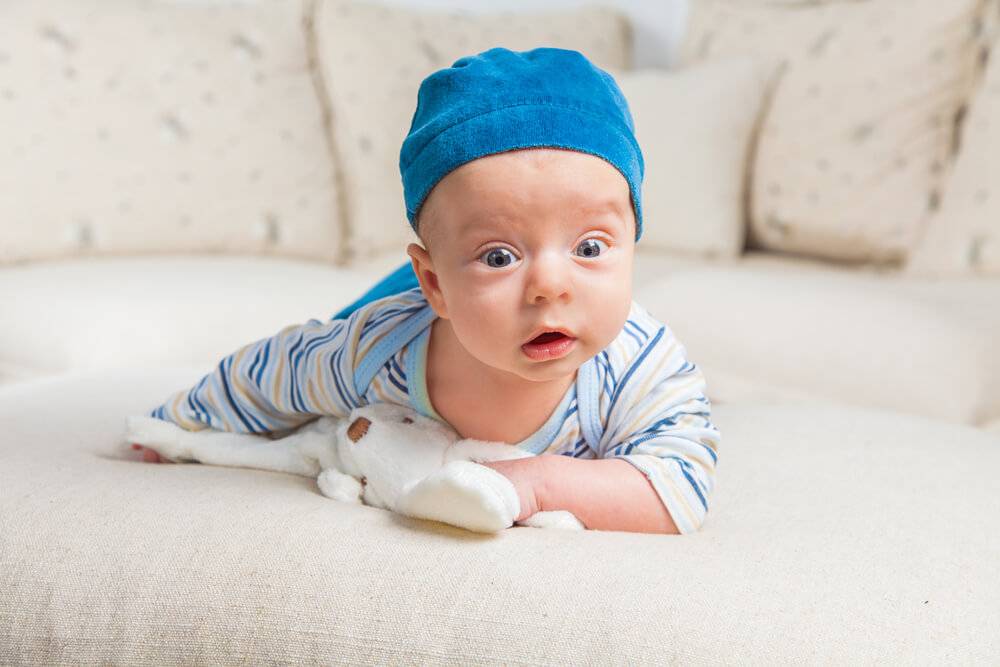 Для стимуляции умения поднимания головы и плеч в позе лежа на животе (когда малыш опирается на предплечья) чаще выкладывайте ребенка на живот с одновременным раскладыванием вокруг младенца ярких игрушек. С этой целью также часто используются специальные .