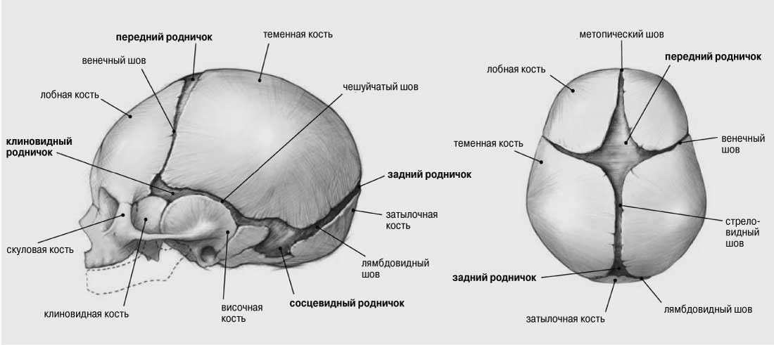 Такое анатомическое «взаимопонимание» возможно благодаря особенностям строения черепа плода. Он состоит из тех же костей, что и череп взрослого человека. Но кости свода черепа младенца отличаются высокой эластичностью и соединены между собой своеобразными амортизаторами – неокостеневшими соединительнотканными участками.