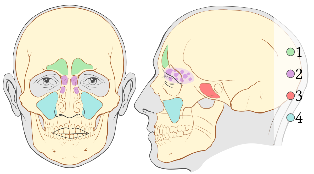 Околоносовые (придаточные) пазухи носа — это своеобразные воздухоносные «карманы» в черепе. Они расположены вокруг носовой полости и связаны с ней посредством соустий (небольших отверстий).