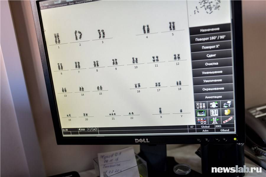 Это анализ хромосом. У здорового человека все хромосомы парные, на снимке под номером 21 три хромосомы вместо двух. Так выглядит синдром Дауна