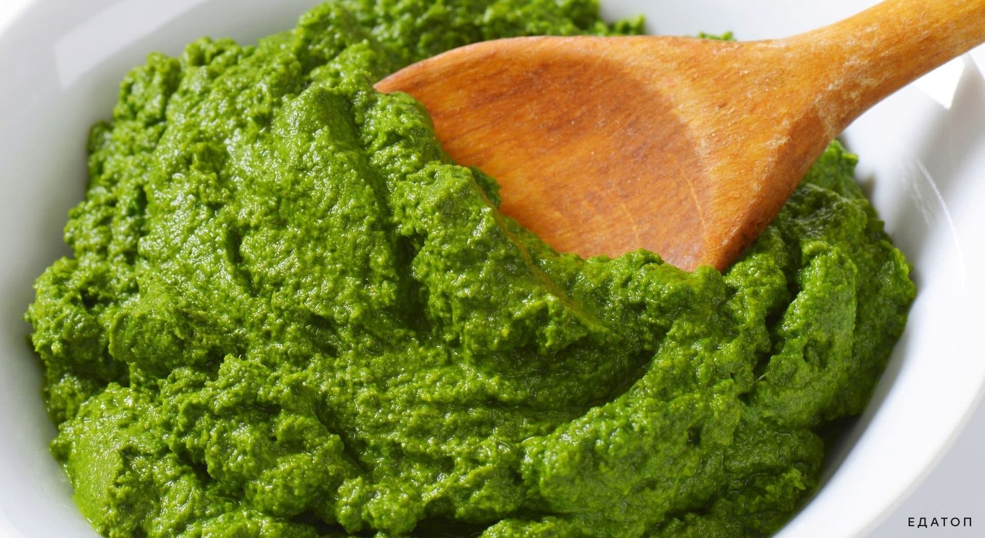 Зелень тщательно моется, обсушивается и режется, поле чего ее выкладывают в разогретый сотейник, в котором предварительно было растоплено масло. Смесь тушится на протяжении 15 минут при постоянном помешивании. Затем ее снимают с огня, дают слегка остыть, добавляют специи и пюрируют при помощи блендера. При подаче блюдо украшается семенами кунжута.