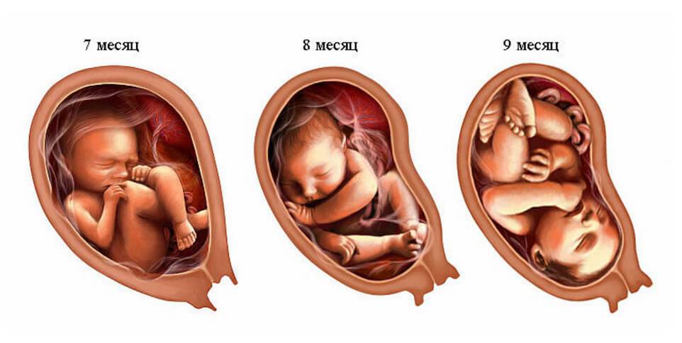 С 7-го месяца (28-31 недели) женщина часто чувствует усталость. Появляются отеки, возникают сосудистые сеточки. Начинается одышка. Матка давит и на седалищные нервы, вызывая периодическую боль. Из-за натяжения кожи тело может начать зудеть, иногда образуются растяжки.