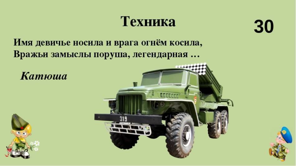 «Девушка» ходит, Песню заводит, Враг услышит — Сразу не дышит. Ответ: катюша.
