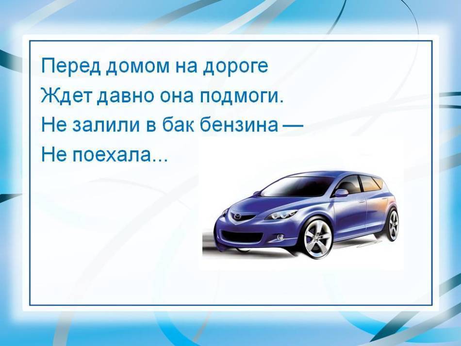 Она доставит без трудаТебя в другие города.Но если ты собрался в путьЕе заправить не забудь!..