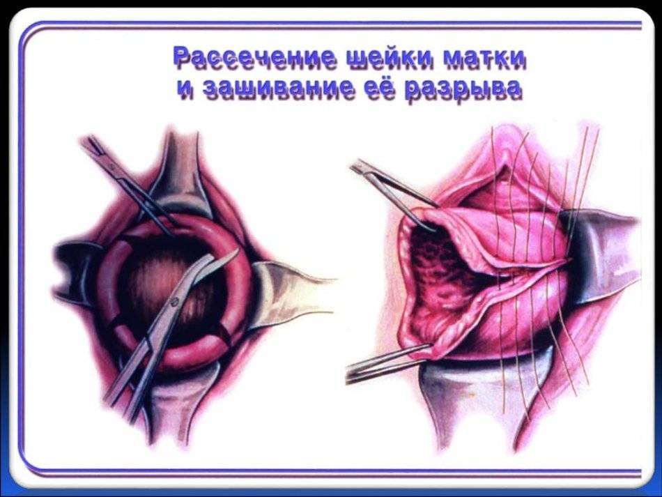 В ходе родов обычно наблюдаются разрывы в области шейки и промежности. Как указывалось выше, сейчас процесс ведения родов предусмотрен таким образом, чтобы в ходе манипуляции не было разрывов, проще говоря ткани разрезают.