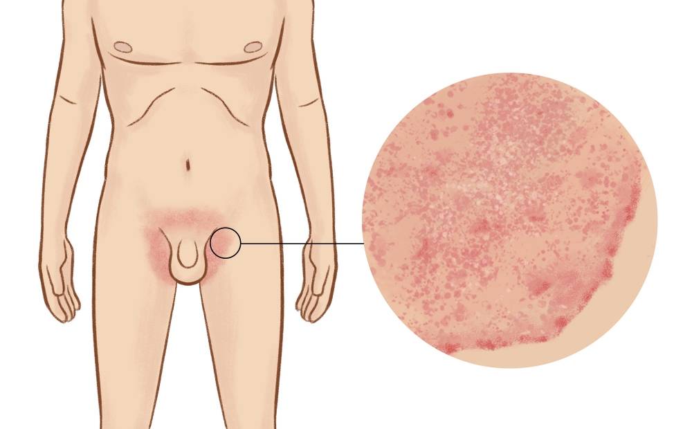 Чаще это грибки рода Кандида, передающиеся при половом акте. Одновременно с покраснением и зудом в паху, у мужчины будет воспаление и налёт на головке полового члена, белые выделения из уретры.