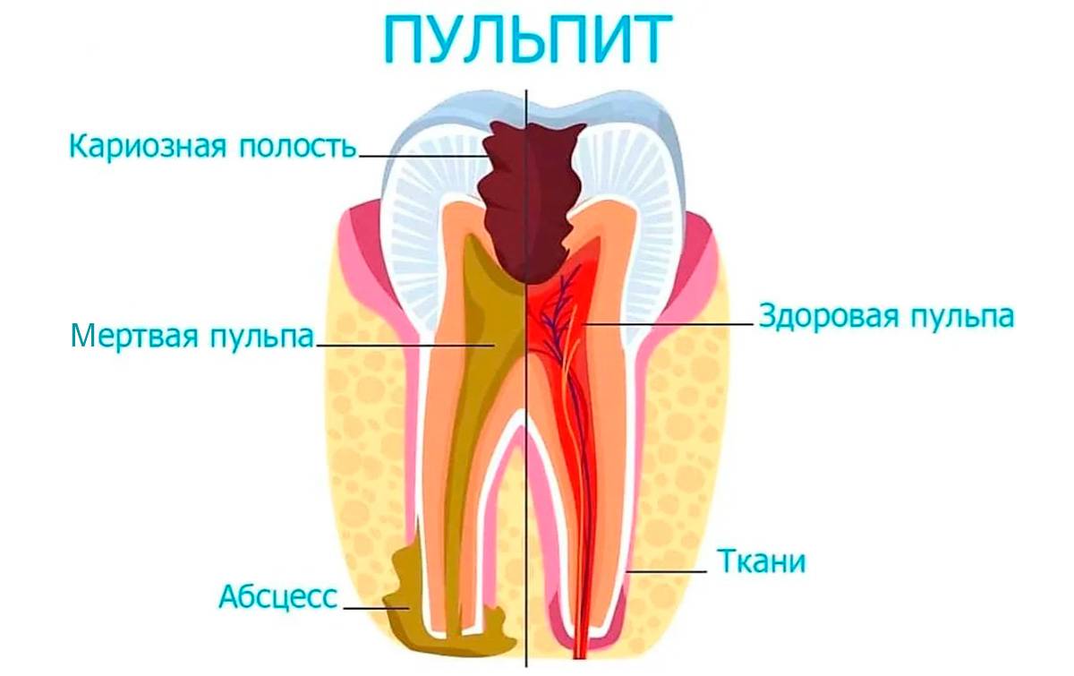 Пульпит — это воспаление пульпы — нервных тканей внутри зуба. Зачастую оно возникает у людей с запущенным кариесом на глубокой стадии. Для пульпита характерны следующие симптомы:
