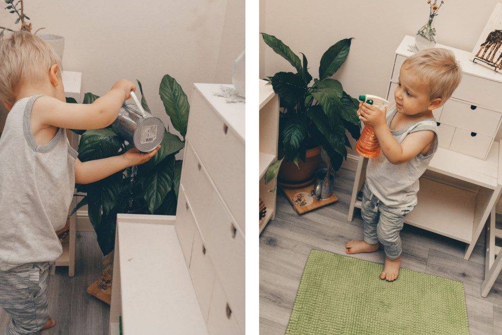 Для упражнений практической жизни я поставила в детской цветок, который можно поливать и опрыскивать