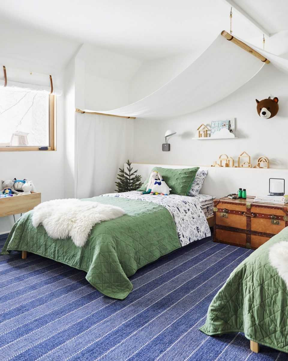 Также популярно расположение кроватей по одной стене. С противоположной стороны устанавливаются системы хранения, и обустраивается зона для игр.