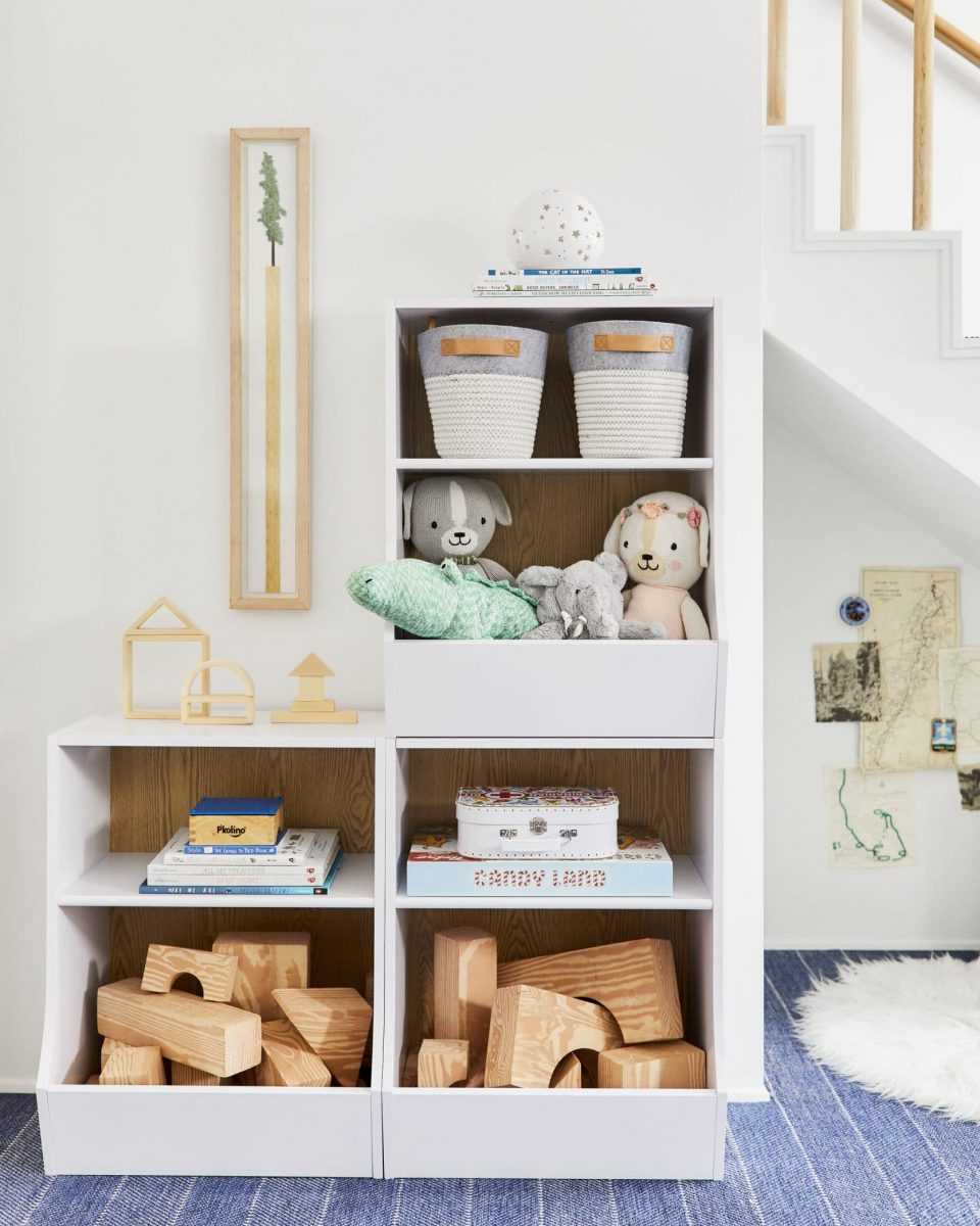 Важно заранее продумать расположение систем хранения, чтобы приучить ребенка к порядку с детства