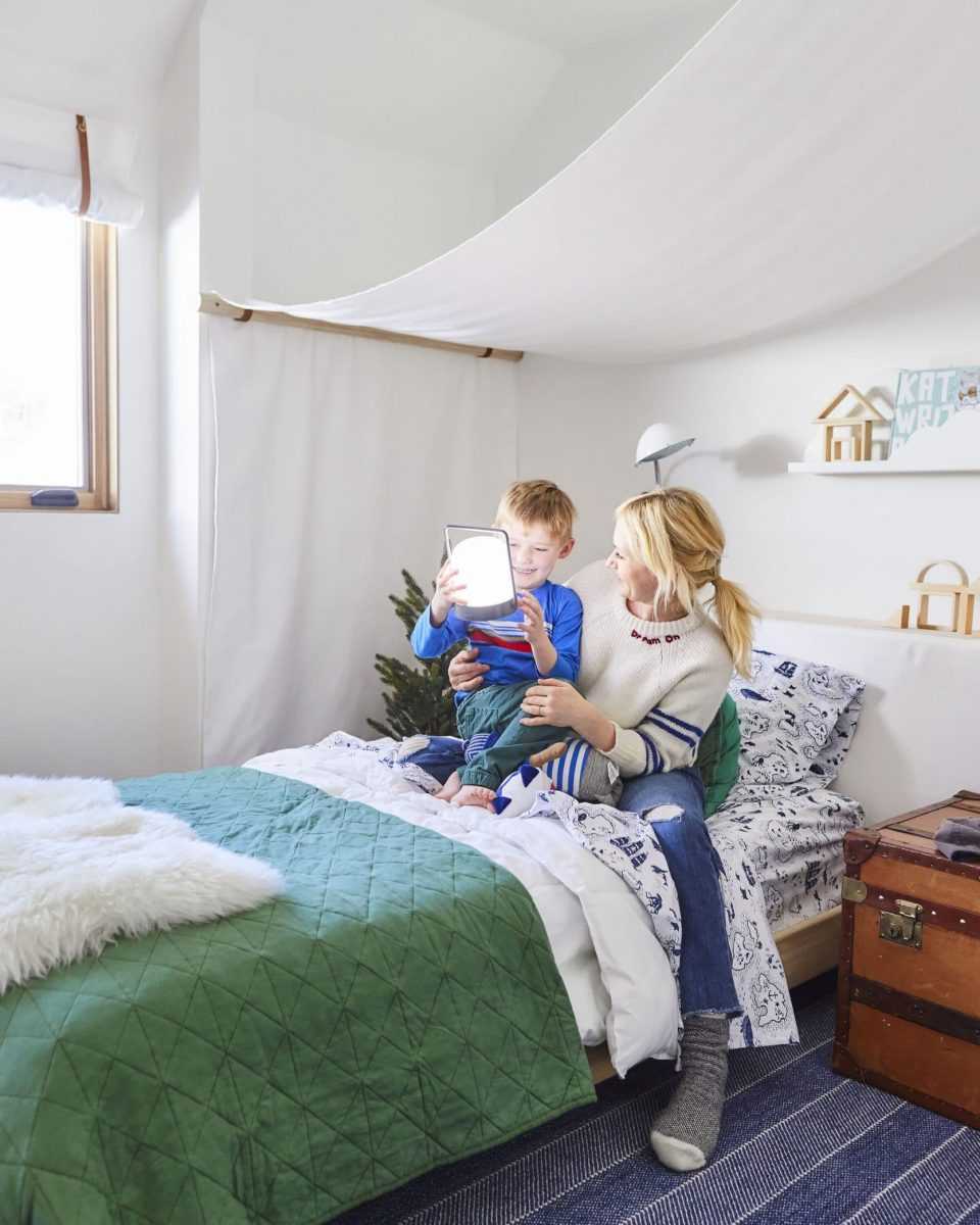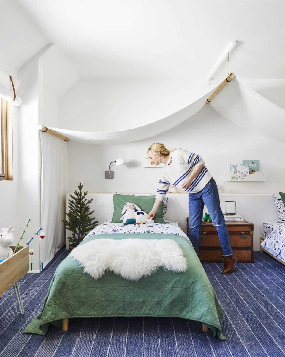 Одна из главных задач: создать в комнате много света, вместо тяжелых портьер достаточно разместить легкий тюль и дополнить его римскими шторами блэкаут (если это необходимо). Около кроватей поставить торшеры или бра, они будут создавать приятную атмосферу вечером, дети могут читать в постели перед сном.