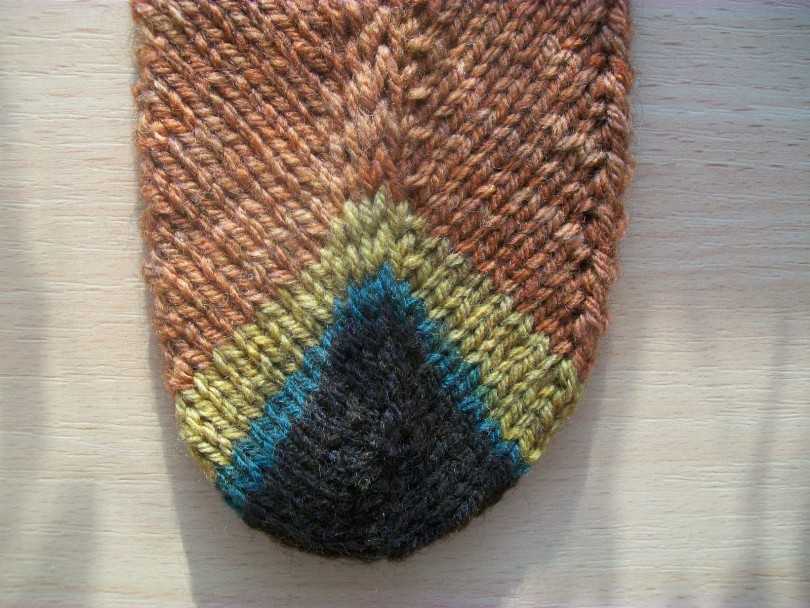 Пяточка вяжется 15 рядов, а убавление делается так же, как и в первом способе. Только набор петель делается по краю убавленных петель.