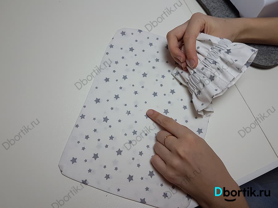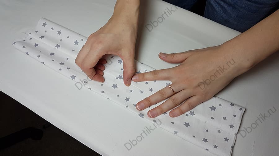 Сложить заготовки лицом друг к другу (изнанкой наружу), сметать. Оставить не зашитым участок снизу, между двумя выступающими краями бортиков.