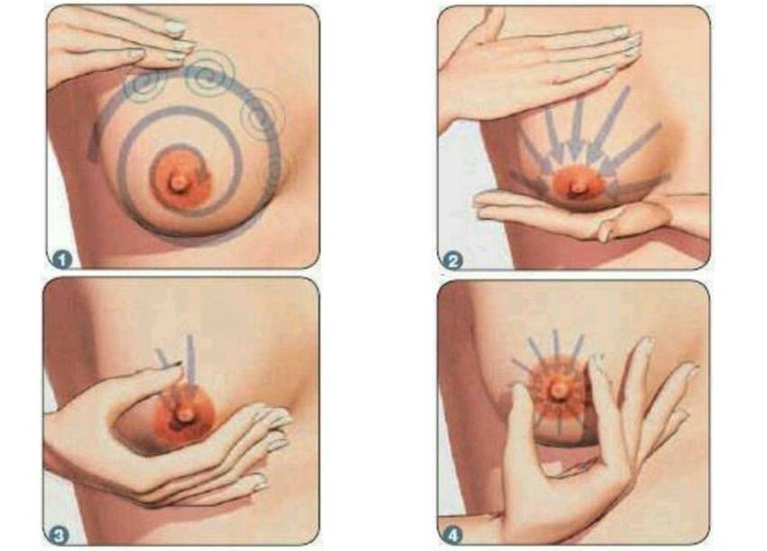 - Начинайте медленно массировать грудь большим пальцем по направлению к соску, круговыми движениями как бы выталкивая молоко и разминая застой.